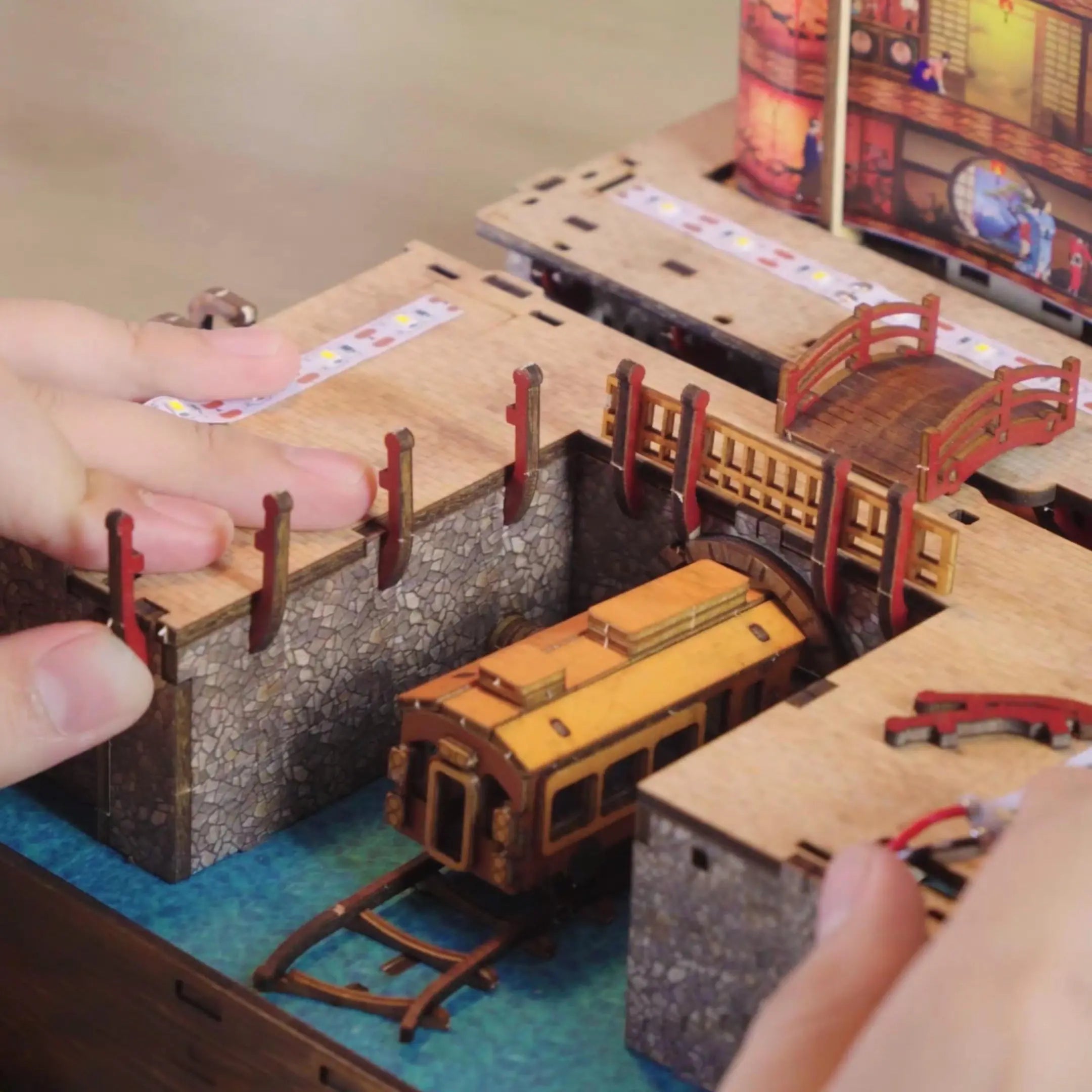 Ginzan Onsen was inspired by a memorable trip to Japan 2022, where we were deeply moved by the quiet beauty and atmosphere of this historic hot spring town. Capturing that feeling took us seven months of design and refinement. The greatest challenge was engineering a single motor to drive two independent motion systems: one animating a server moving inside the main ryokan, and another powering water pumps in the smaller riverside houses. Each building was carefully constructed to reflect traditional Japanese wooden architecture and building techniques, bringing Ginzan Onsen’s spirit to life in miniature.